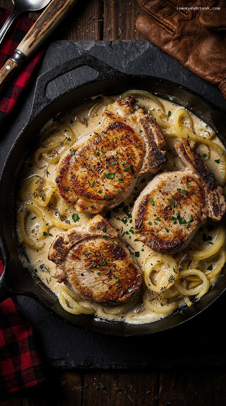 • 7. Rest 5 minutes, spoon sauce and onions over chops, garnish with parsley.