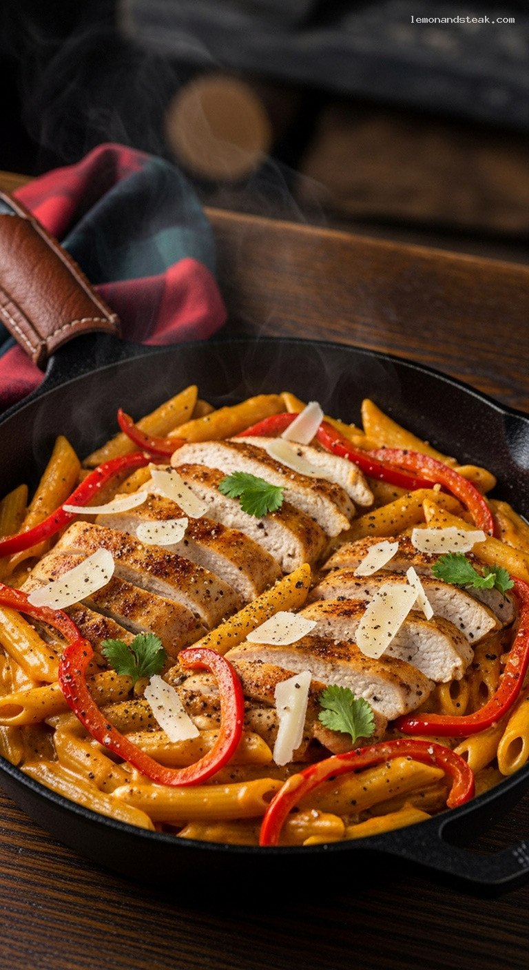 Return the cooked chicken (and any accumulated juices) to the skillet, stirring to coat the pieces in the sauce. Add the drained pasta and toss gently until everything is well combined and the pasta is completely coated. If the sauce seems too thick or tight, add a splash of the reserved pasta water—1–2 tablespoons at a time—until it reaches your desired creaminess. Squeeze in the juice of 1/2 lime and stir; the brightness cuts through the richness and makes the flavors pop. Remove from heat, sprinkle with chopped cilantro or parsley if using, and add an extra dusting of Parmesan and black pepper. Serve hot, straight from the pan or in warm bowls.