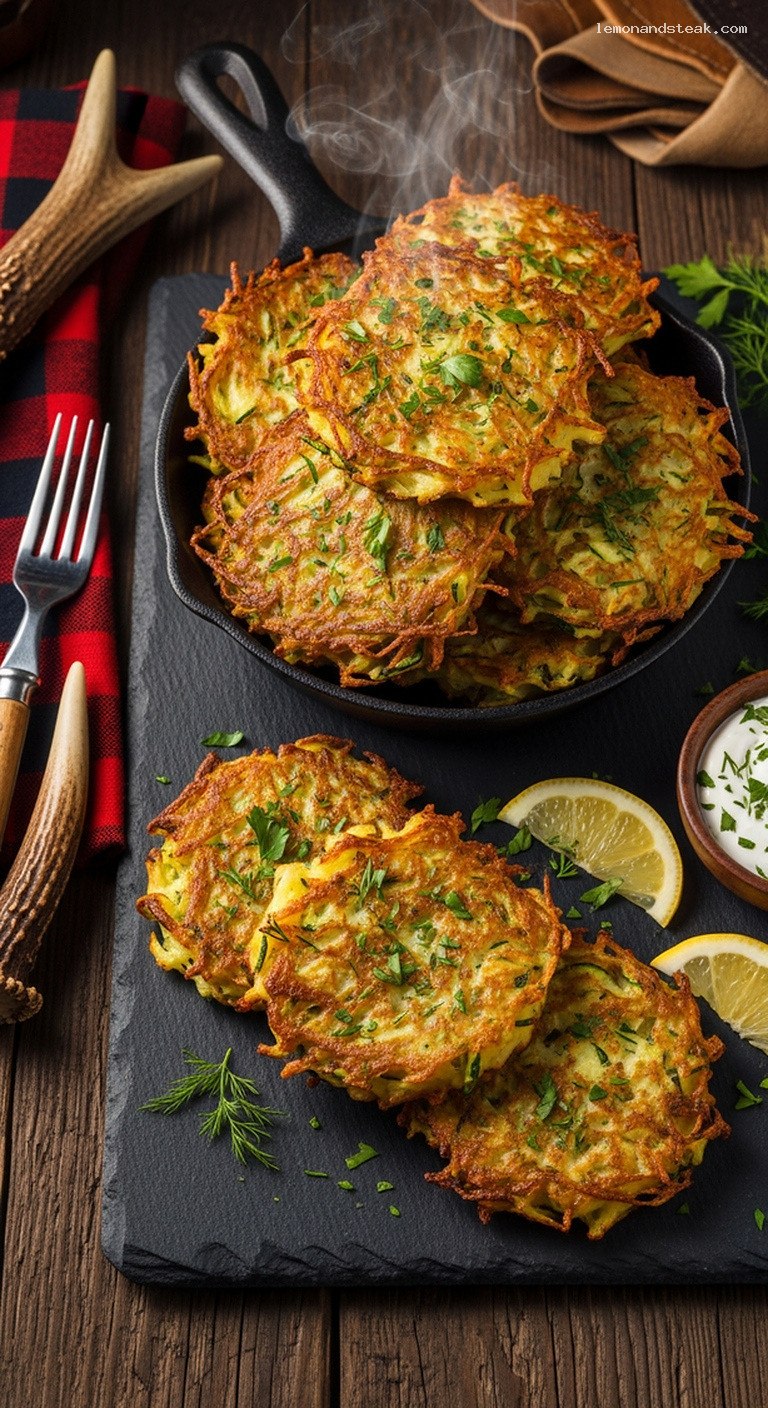 Serve immediately with lemon wedges for squeezing over the top and a generous dollop of sour cream or Greek yogurt on the side. The bright lemon and cool, creamy topping balance the crisp, savory fritters perfectly. Enjoy them as a snack, appetizer, or a side dish with grilled meats, roasted chicken, or a simple green salad.