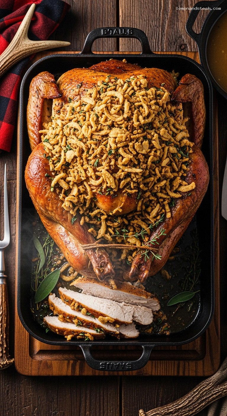 - Pantry: Whole turkey (12–14 lb), kosher salt, black pepper, paprika, low-sodium chicken or turkey broth, store-bought crispy fried onions, panko breadcrumbs, all-purpose flour, olive oil (optional)