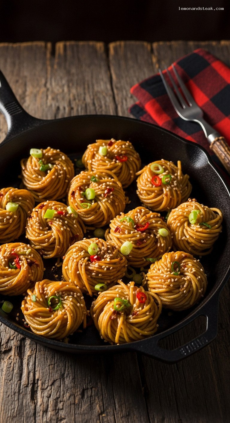 These sesame noodle knots are at their best straight out of the pan, when the edges are still shatteringly crisp. If you need to make them ahead, you can crisp them as directed, cool completely, and store in an airtight container in the refrigerator for up to 2 days. Reheat on a lightly oiled skillet over medium heat for 3–4 minutes per side until hot and re-crisped, adding a splash of water to loosen any stuck glaze. The sesame-soy glaze itself can be made up to 3 days in advance and refrigerated in a small jar; give it a good shake or stir before using. Avoid freezing, as the texture of the noodles becomes mushy after thawing.
