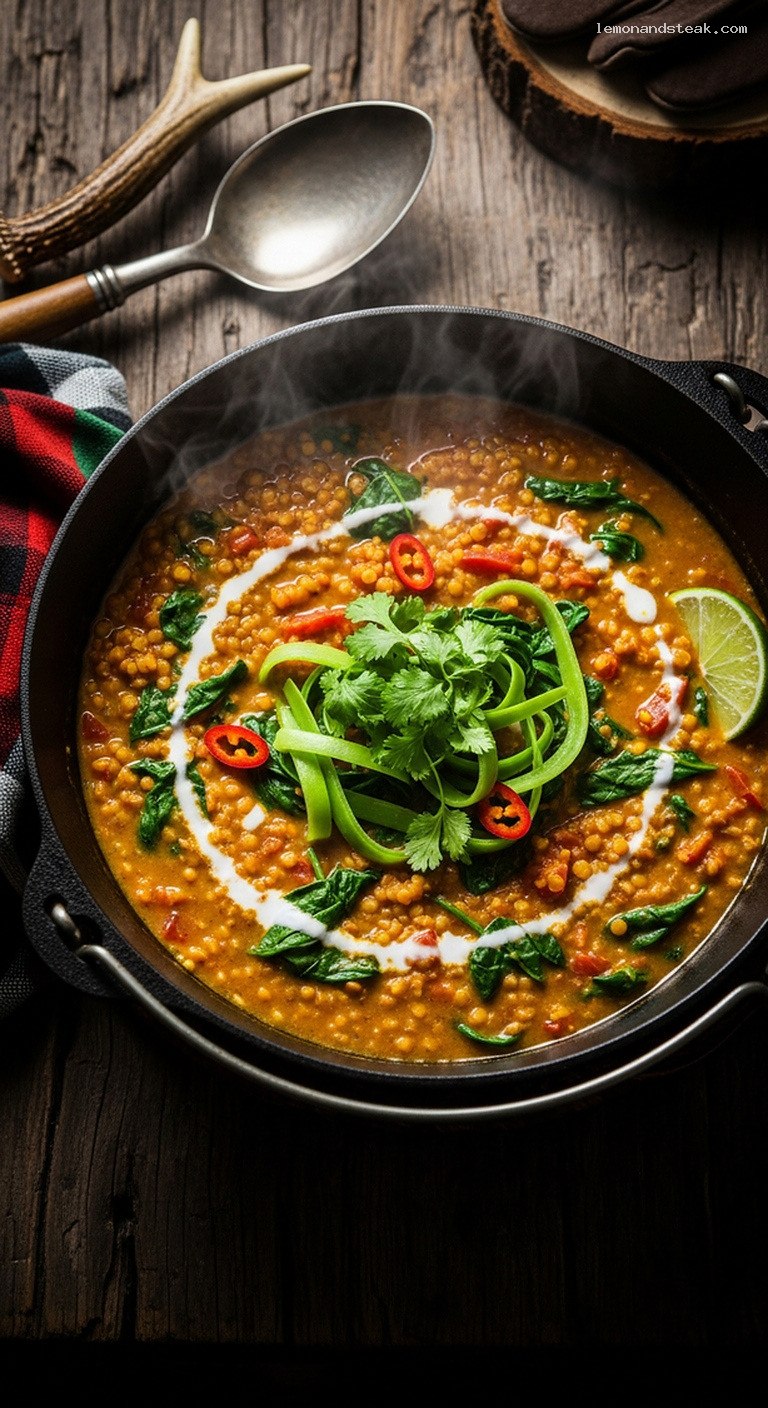 Ladle the spicy lentil and turmeric stew into warm bowls. Top each bowl with a sprinkle of chopped fresh cilantro and an extra grind of black pepper. Add a dollop of plain yogurt or coconut yogurt if you like a cooling contrast to the heat. Serve with lime or lemon wedges on the side for squeezing over just before eating. Pair the stew with steamed rice, crusty bread, or warm flatbread to soak up the flavorful, golden broth. Enjoy it steaming hot for the most comforting, cozy experience.