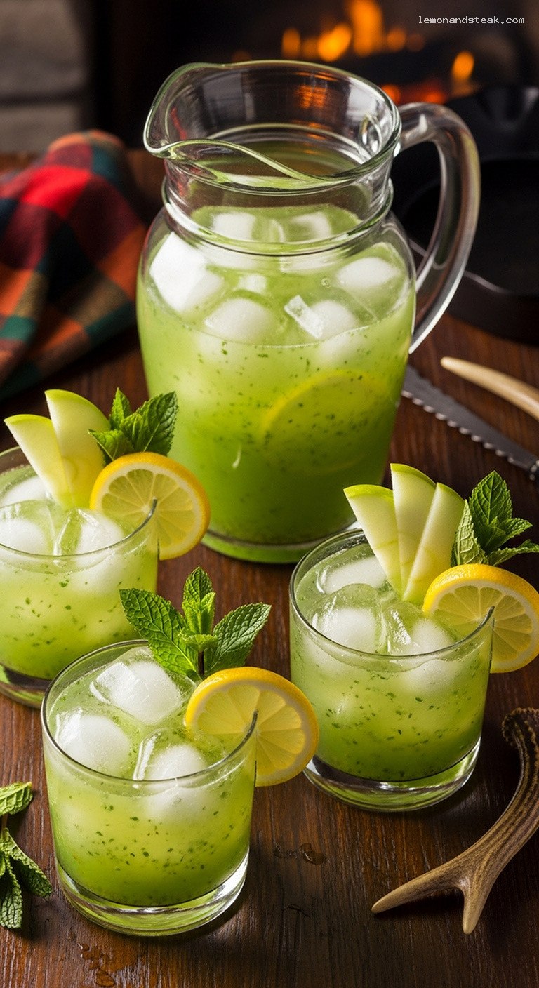 • 7. Serve: Fill glasses with ice, pour in the green apple–mint lemonade, and garnish with mint, thin apple slices, and lemon wheels.